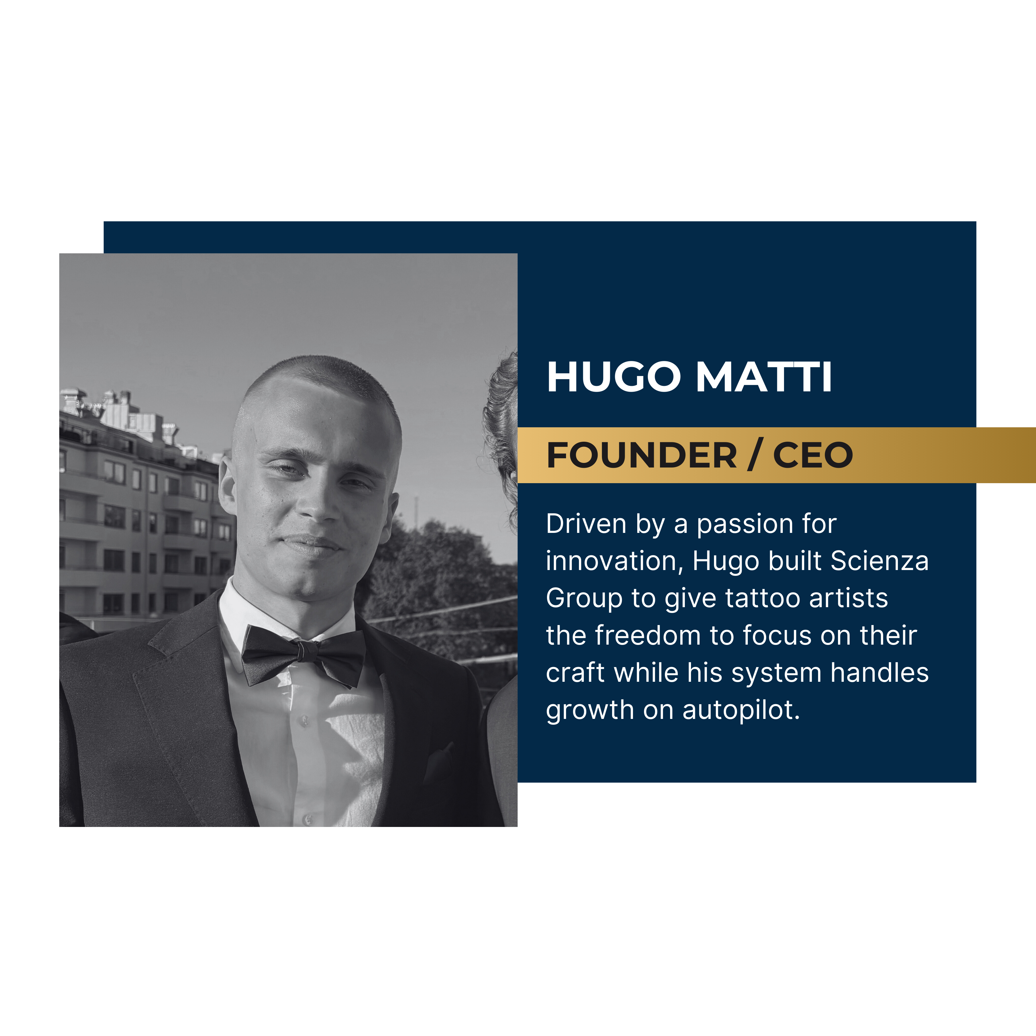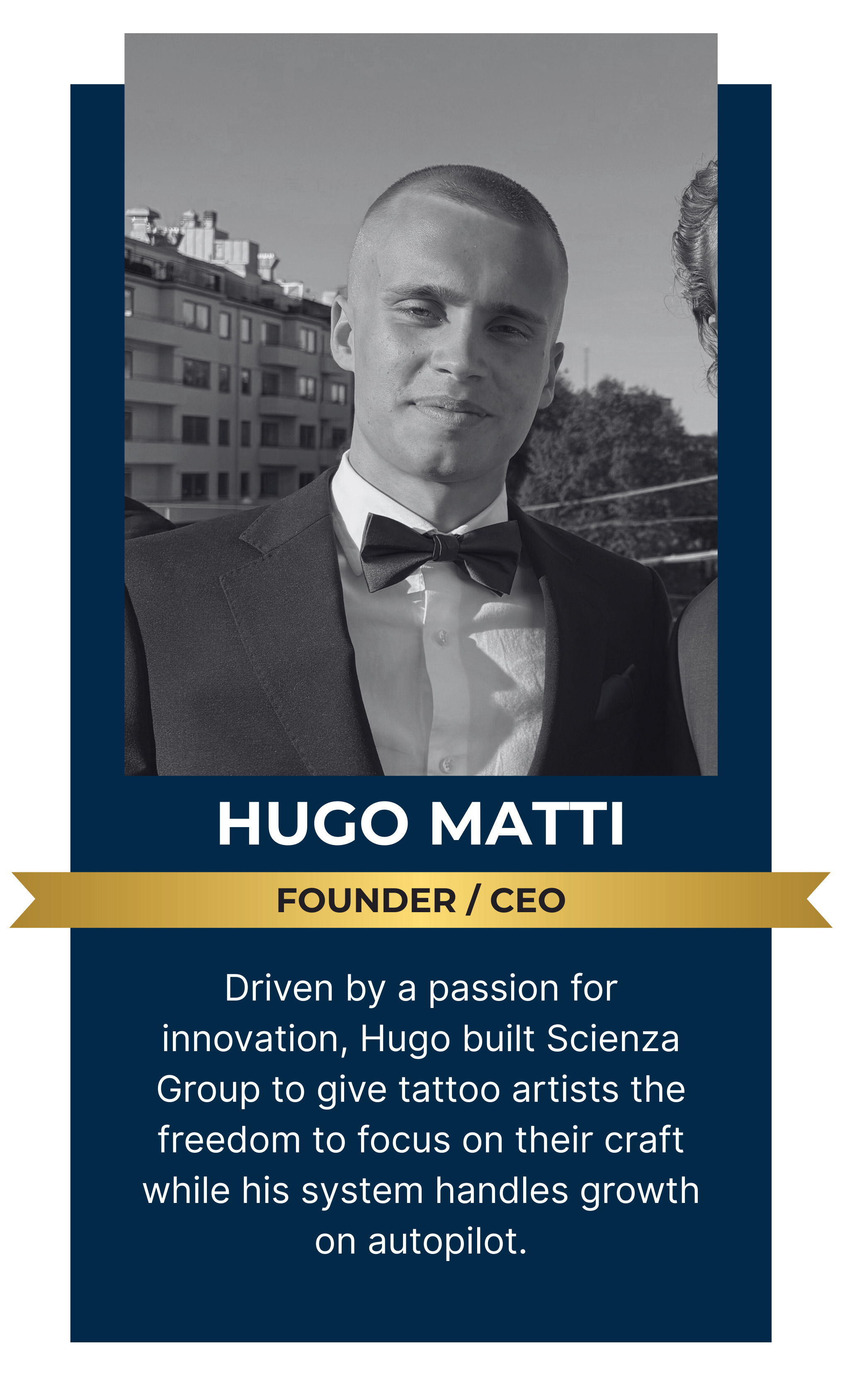 Scienza Group was founded by Hugo Matti, an entrepreneur with a passion for both tattoo culture and business growth. After seeing how many talented artists struggled to grow their studios because of complex marketing and client management, Hugo set out to create a system that removed those barriers.